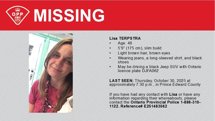 Prince Edward County OPP are asking for the public's help to locate a missing woman. Lisa Terpstra, age 48, is described as as 5'9" with a slim build,...